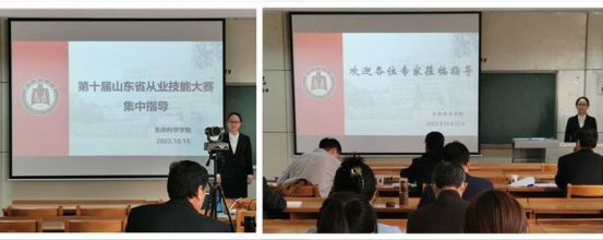 为迎接即将到来的第十届山东省师范生从业技能大赛,提高选手竞赛水平,10月15、16日学院邀请中学指导教师王爱君、盛兴汝、王鑫、孔勇、孔峰等以线上线下相结合的方式进行集中指导,10月22日邀请学校教学论专家苗深花教授、张祥沛教授、李建斌老师等在生物楼208再次进行集中指导。院长助理燕艳,教学论教研室主任郭永峰及全体指导教师、参赛选手和部分学科教学(生物)专业的研究生参加了集中指导活动。