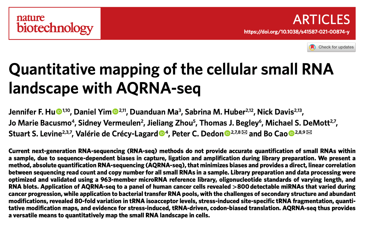 曹博教授团队在RNA遗传调控研究方向取得突破性进展,在国际著名期刊《Nature Biotechnology》发表了题为“Quantitative mapping of the cellular small RNA landscape with AQRNA-seq”的研究性论文。该项成果中研发的AQRNA-seq(Absolute Quantification RNA-seq)技术,首次实现了全局性RNA分子绝对定量分析,该技术已经获得授权国际PCT、美国、欧洲和中国专利各一项,曹博均为第一发明人。研究论文由曹博与美国麻省理工学院,联合弗罗里达大学、纽约州立大学等单位合作完成,曹博教授为论文的主通讯作者,天天a片