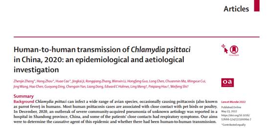 陈浩副教授与山东第一医科大学、山东第一医科大学第二附属医院、泰安市疾病预防控制中心等机构合作在柳叶刀子刊The Lancet Microbe发表了“Human-to-human transmission of Chlamydia psittaci in China, 2020: an epidemiological and aetiological investigation”的研究论文。