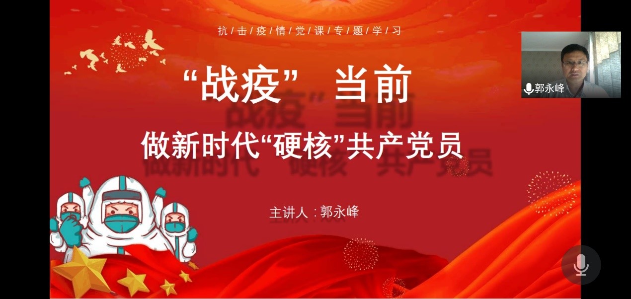2020年7月8日下午,天天a片 教工党支部书记郭永峰为全体党员在腾讯会议上讲了题为“战疫当前,做新时代硬核共产党员”的党课。郭永峰围绕“透过战‘疫’的烽烟我们应当看到什么”、“对接战斗的过程我们应当做什么”、“直面未来的战场我们应该做什么”三个问题详细剖析了中国特色社会主义制度的优越性以及新时代共产党员的职责,切实提高了支部全体党员的“四个意识”、有效增强了“四个自信”。教工党支部全体成员参加了活动。
