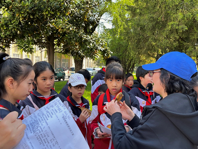 活动过程中,小学生们在各位老师的带领下,认识了多种校园植物,仔细观察了植物的特征,了解了植物名字的来历及其价值。在老师绘声绘色的描述下,同学们听的特别认真,并且能表达自己对植物的理解和感受。小朋友们亲眼观察,亲手触碰植物的叶、花、果实等,对植物产生更深刻的印象。在桃李园,他们在老师的引导下,对各种树木的树皮进行了拓印,亲身实践,感悟了自然之美。最后,全体师生来到天天a片