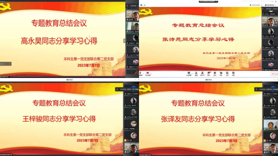 高永昊、张诗苑、王梓骏、张译友四位同志对该专题的学习发表自己的认识与见解。其中,高永昊同志在发言中表示,中国精神是中国人民在漫长的历史进程中形成的核心价值观和品质。我们应将中国精神,结合现代化特征,融入到个体发展中,用青春力量与青春行动做新时代文明下中国精神的践行者。王梓骏、张译友两位同志表示,要“不忘初心、牢记使命,一鼓作气、继续奋斗”,坚持以党性立身做事,弘扬伟大建党精神,继承、发扬中国精神。