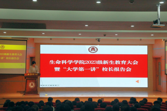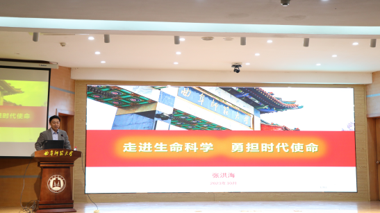 校长张洪海教授以“走进生命科学,勇担时代使命”为主题,开启“大学第一讲”。他在报告中教育引导生科学子自觉站到学习贯彻习近平生态文明思想的高度,认识生命科学的重要意义和价值,鼓励学子将个人科研追求和国家战略需要紧密结合起来,树立科技报国的远大理想。报告会还通过概括阐述科学与科学史的内涵,梳理生物科学的发展历程,展示了开阔宏大的生命科学视角,帮助同学们扩充了学科视野,丰富了专业认知,启发了学术思维,激发了科学探索精神,为同学们的大学专业学习创造了良好的开端。