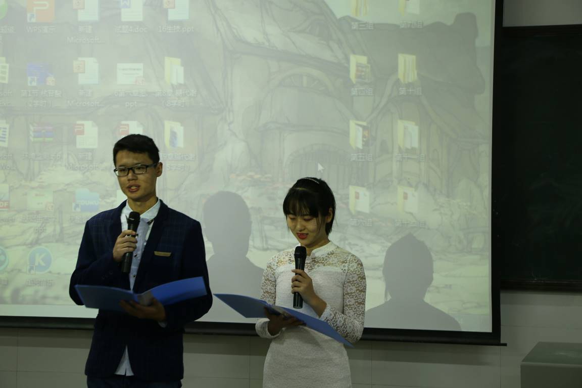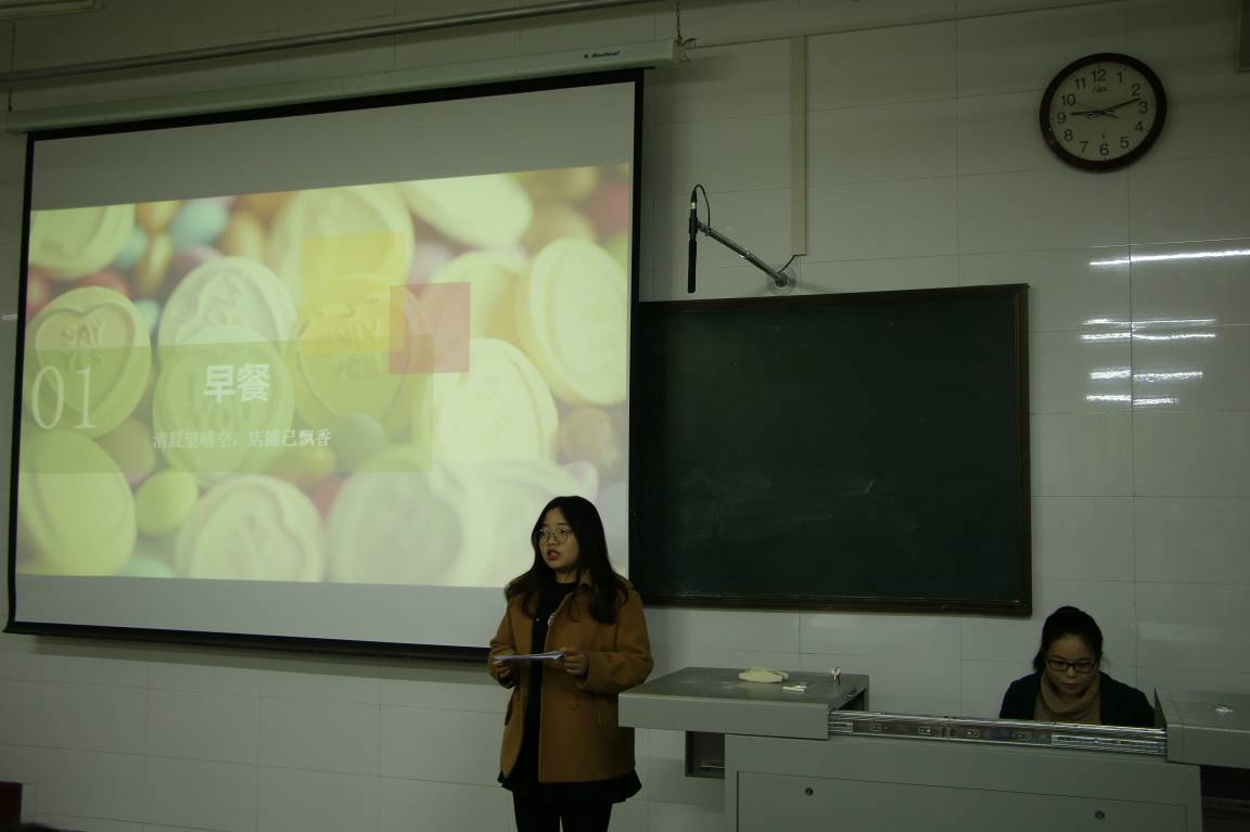 比赛一开始,每组参赛者先展示自己的才艺,然后对自己发掘的美食进行介绍。同学们的才艺展示形式多种多样,说相声、拉二胡、讲笑话、唱歌、甚至还有的现场改编了歌词。然后,同学们用ppt、视频等形式来展示美食,现场的解说更是令人口水直流:他们有的侧重校园内的美食,有的侧重校园外的美食,有的则侧重美食的制作方法。选手们精彩的讲解得到了评委们的好评。“你来比划我来猜”小游戏更好的活跃了现场的气氛。比赛间隙的精彩节目赢得阵阵喝彩。