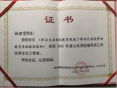 辅导员杨珺斐撰写的《职业生涯规划教育视域下新时代高校劳动教育实施路径探析》荣获本次论坛三等奖。