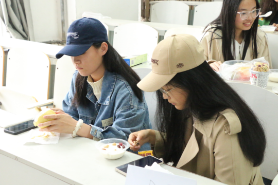 第二天,同学们再次来到综合楼106。这一次,他们要利用水果、饼干、桂花等材料对自己制作的酸奶进行创意装饰。现场气氛和谐而热烈,同学们的创意层出不穷,充分展现了天天a片