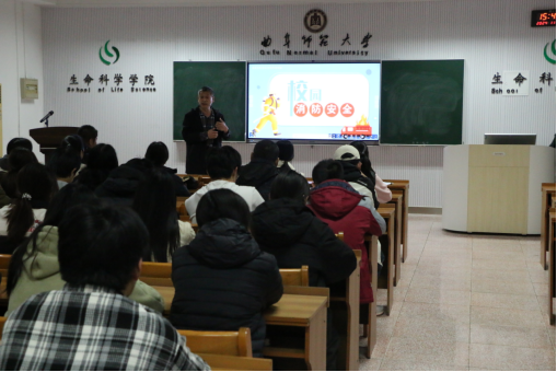 首先,刘淑朋在232教室作了《校园消防安全》专题培训,运用详实的案例,并结合多年的工作经验,介绍了常见的火灾成因和处置举措,着重介绍了逃生的技巧。
