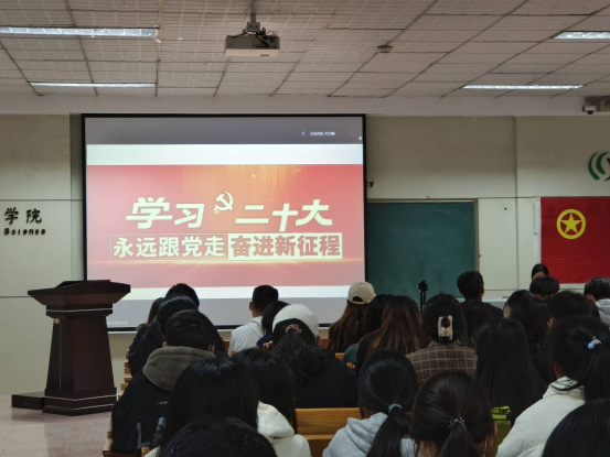 学院团委组织部副部长杨羽、党建学生工作部副部长陈静作为学生代表分别进行交流发言,分享学习心得。杨羽从学习党的二十大精神、领会党的二十大的重大意义两个方面进行了交流分享,强调了中国青年坚定不移听党话、跟党走的必要性,并号召大家作为肩负人民期待和时代重任的青年,应主动将个人理想行动融汇在党和人民的伟大事业中,以理论武装筑牢信仰根基,坚定为理想实施奋斗的信念。陈静从在十年伟大变革中汲取精神力量、投入中国式现代化伟大事业、争当担当民族复兴重任的新时代好青年三个方面分享了心得感悟,表达了自己作为青年一代,争做走在时代前列的奋进者、开拓者、奉献者的决心。