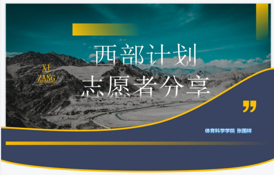 张国祥曾服务于西藏阿里地区人力资源和社会保障局,从如何知道大学生志愿服务西部计划项目、西部计划亲身经历分享、参加大学生志愿服务西部计划项目的收获三个方面向同学们介绍了自己参加西部计划志愿者服务项目的心得体会和收获。