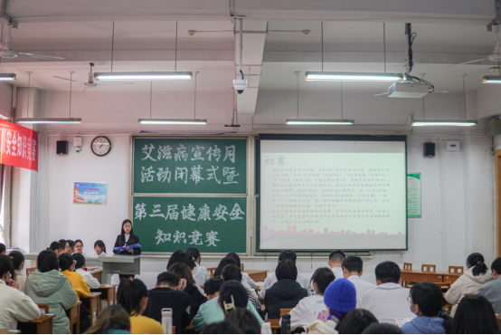 本次活动首先进行的是健康安全知识竞赛,来自各个学院的十二支队伍,抽签决定出场顺序,依次答题,经过激烈的比拼,最终决出冠军。随后,李奕璇同学向大家宣讲了艾滋病的相关专业知识。