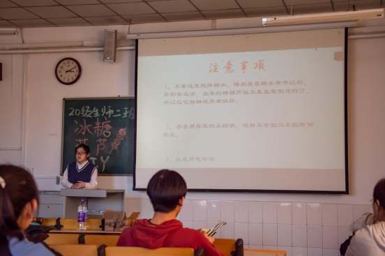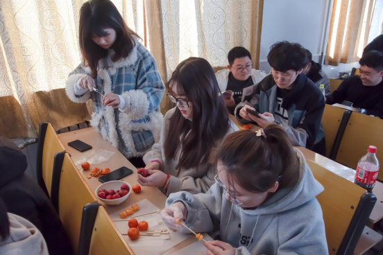 同学们分为两组,A组成员发挥合作精神,现场积极查找资料,团结协作,努力克服了最困难的熬糖环节。B组成员推陈出新,突破传统材料的限制,使用多种非传统材料,制作出各类新颖美味的冰糖葫芦。在A、B两组同学的合作下,同学们为冰糖葫芦蘸糖,待糖衣冷却后,美味的冰糖葫芦制作完成。