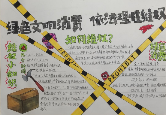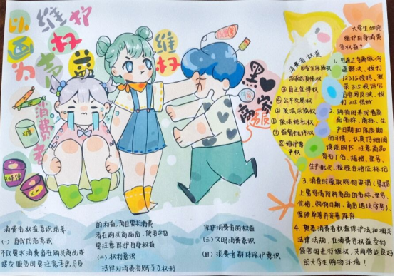 本次活动采用线上线下相结合的方式举办。参赛选手们以小组为单位,以权益知识为主要素材进行作品设计,同学们利用图画等形式对手抄报进行设计排版,内容紧扣维权主题,贴近大学生生活实际,趣味性强,展现了同学们精彩的创造力,丰富了同学们的业余生活。选手们将手抄报的图片和创作理念以压缩包的形式上传到举办方指定邮箱中,评委们依据参赛者的画报主题、画报内容等多方面综合评选出每支队伍得分和名次。本次活动圆满结束。