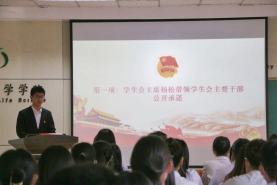 会议伊始,主持人重点强调了举办本次活动的意义,旨在强化学生干部责任意识,增强同学们本次活动的理解和认识;随后,团委学生会主席杨松带领学生会主要干部进行公开承诺;最后,团委副书记、主席团成员以及各部部长在《我为同学办实事》公开承诺书上郑重签下自己的名字。