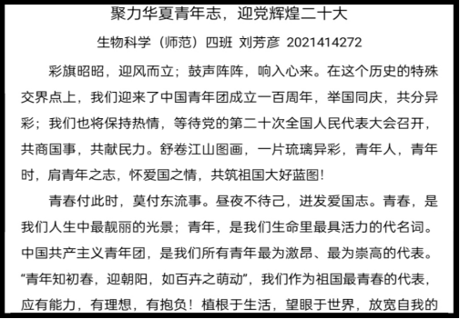 本次活动于线上进行,面向2020级和2021级全体学生,参赛同学按规定投稿。征文中,同学们饱含爱党、爱国、爱社会主义的情感,字里行间都传达着对党和国家的感恩,对未来的期许,生动诠释了“奋进新征程,建功新时代”的青春担当。经过评选,2021级张梓若斩获一等奖,2021级刘芳艳、张诗苑荣获二等奖,2020级庄茜、2021级付媛媛、李喆珺获得三等奖。