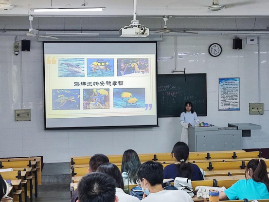 在活动当天,观众入座,参赛人员到场后进行签到,现场秩序有条不紊。在宣讲过程中,六支参赛队伍分别从生物生态、海洋生态、环境污染等方面进行宣讲。其中一组选手着重介绍山东地区特有的动植物,让同学们了解到在家乡生长的生物情况。另一组选手详细地讲述中国生态保护的政策与行动,宣传了更多的生态环保知识。还有一组选手从保护生物多样性的观点出发,以幽默的语言与有趣的配图来引入核心“什么是生物多样性”,“我们作为人类应该怎样更好地保护生物多样性”,给在场的同学们留下了深刻的印象。宣讲完毕后,观众投票并积极回答有关生态知识的问题。这次活动不仅为大学生能够更好地将知识运用于保护生态环境打下基础,还为守护美丽曲园增添一抹专属生科特色的色彩。