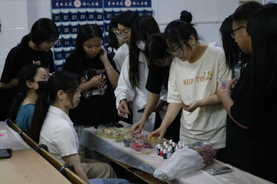 活动伊始,由工作人员向大家介绍滴胶的定义及做法。随后,参赛成员们以小组为单位领取提前混合好的A胶、B胶,并选择心仪的模具和干花,在规定的时间内完成滴胶、上色、装饰等环节,并将成品放置教室最后一排的桌子上,静置2-3天脱模取出。活动过程中,工作人员在场认真指导同学们制作滴胶。每一个滴胶都是同学们智慧和想象力的结晶,让同学们在制作的快乐中提高了动手能力和默契协作能力。最后评委根据作品的呈现效果、创意构思进行点评并评选出名次,完成的滴胶作品由菁蕙学社负责收集保存。