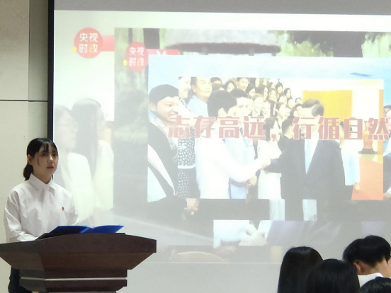 活动在铿锵有力的国歌声中拉开帷幕。随后,同学们共同观看了《习近平与大学生朋友们》时政微纪录,纪录片讲述了习近平总书记与青年学生交流的点点滴滴。习近平总书记对广大青年深情寄语:“愿青年们牢记党的教诲,不负时代、不负韶华、不负人民,在青春的赛道上奋力奔跑,跑出这代人最好的成绩。”观看完视频后,感动之余,同学们对自己身上所肩负的责任与使命有了更加清晰的认识。最后,学生代表陈炳兆、赵一冉等同学分享了个人学习心得。他们提到,习近平总书记始终关心、关怀青年成长发展,高度重视青年工作,为广大青年树立了学习榜样,习近平总书记亲和、诚挚、处处为人民着想的形象更加生动,我们也更加坚定了把青春与祖国的前途和命运紧密相连的决心。