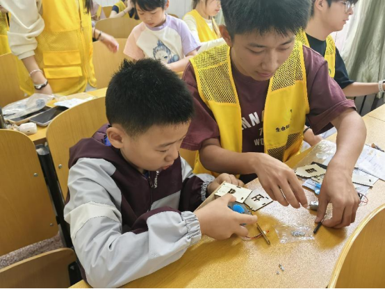 学生结合所学知识,用通俗易懂的语言向小朋友们讲解光能转化、电流传导等科学原理,并指导他们动手拼接电路、组装模型。