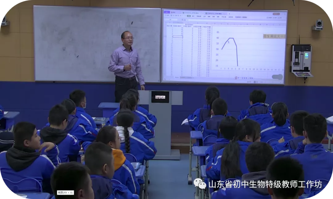 特级教师工作坊青岛群组成员、胶州市第二初级实验中学的雷绪山老师展示了青岛市公开课《生物的变异》。雷老师以花生为线索贯穿始终,引导学生认识到花生品种的多样性,探究花生变异的原因,探索花生的育种方法,使不同层次的学生在探究和合作中体会到科学探究的严谨性与艰巨性。袁隆平的视频,进一步升华了思想,启迪了学生的思维。在统计花生果实大小变异环节,雷老师没有让学生进行大量重复统计,而是巧妙地运用全班大数据,利用电脑现场处理数据,即时生成曲线图,形象直观,节省下大量时间引导学生分析数据,深度思考,得出结论,使不同层次的学生都参与其中,感受探究的魅力。